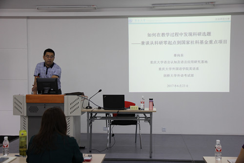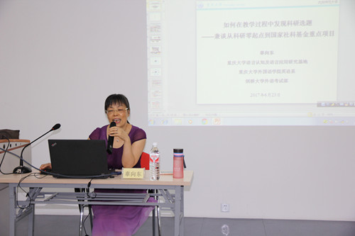 下午,辜教授做了题为《外语学科实证研究选题、思路与方法兼谈硕士生团队建设》的学术报告。辜教授通过她自己培养员工的实例,告诉老师们要善于发挥员工的优势,挖掘员工的潜能,不断鼓励员工实践与创新,并向老师们展示了员工的学习日志。在报告的结尾,辜教授耐心地回答了老师们的问题与疑惑,相互交流与学习。