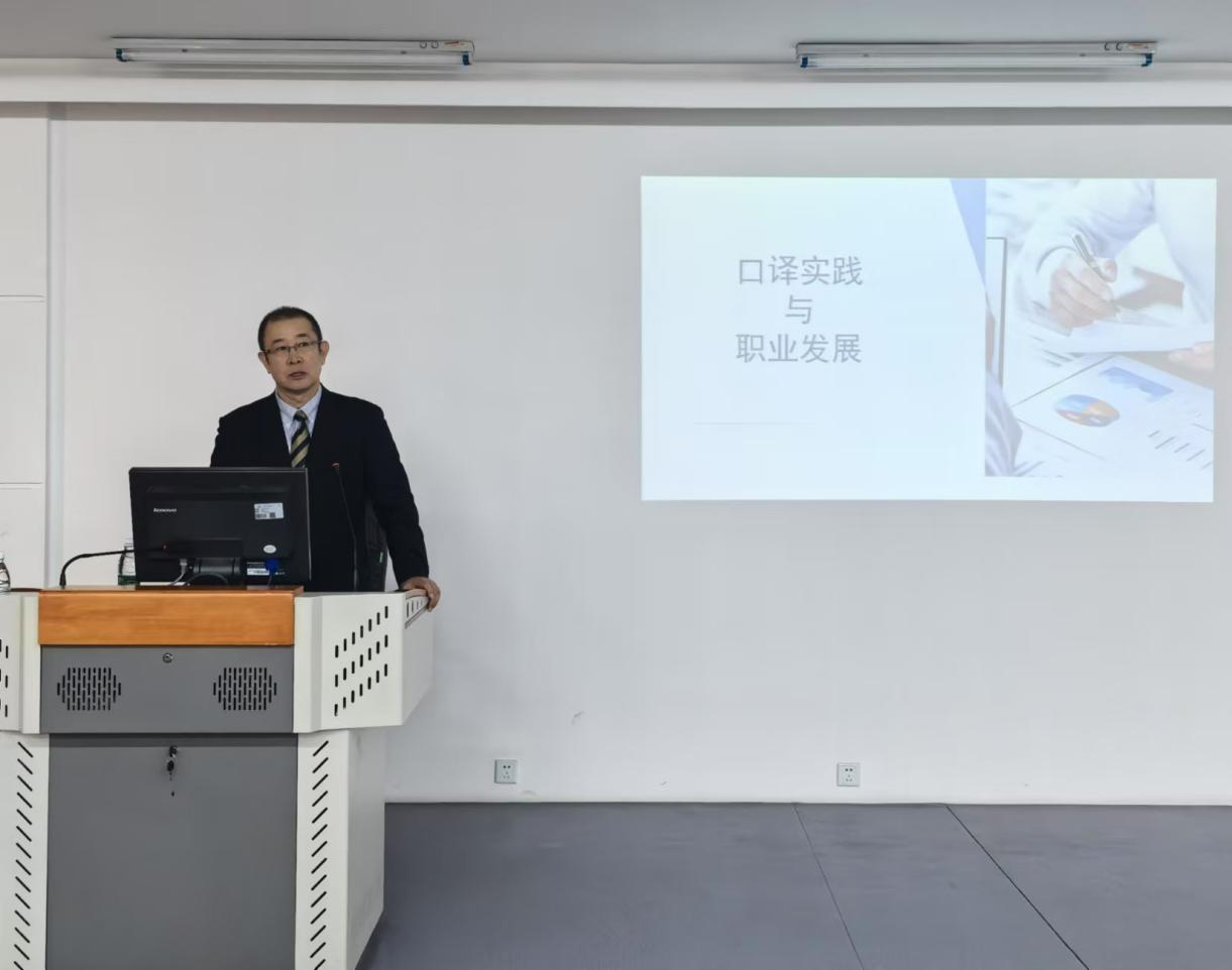 有着近30年同声传译、即席翻译经验的李向荣老师结合自己的外事工作经验和切身体会,分享了他亲身经历的翻译成功经验和教训。李老师以自己难忘的外事翻译活动出发,为大家讲述了自己在翻译“新手”时,初次意识到自己的口译还需要提升的契机,向同学们提出扎实的双语能力之外,还需要在日常不断对各个领域词汇的积累以及强大的心理素质的重要性。李老师结合职业发展把学习外语的经验以及如何通过日常学习和日常积累提升外语翻译水平与我们进行了深入的交流。