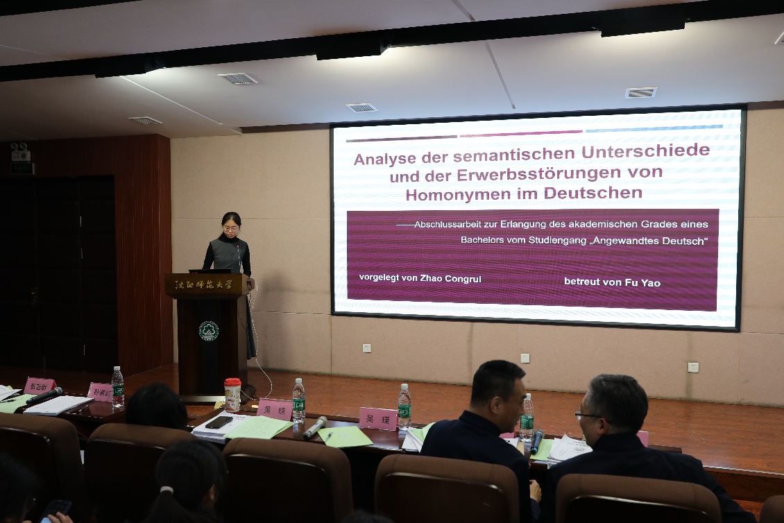 七位参与答辩的同学依序陈述,借助精心制作的 PPT,围绕论文的研究背景、目标、方法、成果及创新之处,以流畅的外文进行 5 至 6 分钟的精彩陈述。答辩委员会成员秉持严谨治学态度,在每位同学展示后,均从内容深度、逻辑结构、学术规范等方面进行深入提问,针对性提出修改建议,并就论文核心观点与研究细节进行细致点评,为提升论文质量指明方向。