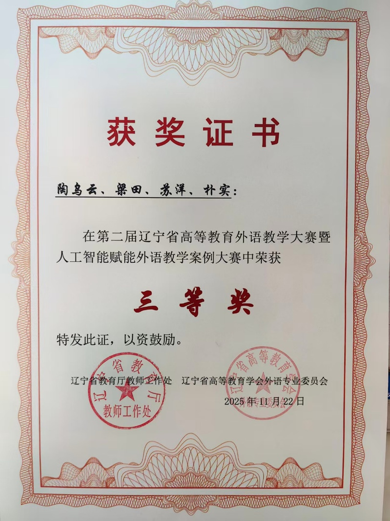 2025年11月,公司日语系教师陶乌云、梁田、苏洋、朴实团队荣获第二届辽宁省人工智能赋能外语教学案例大赛三等奖。
